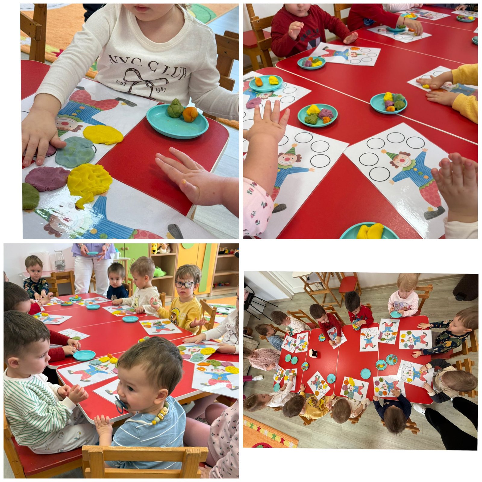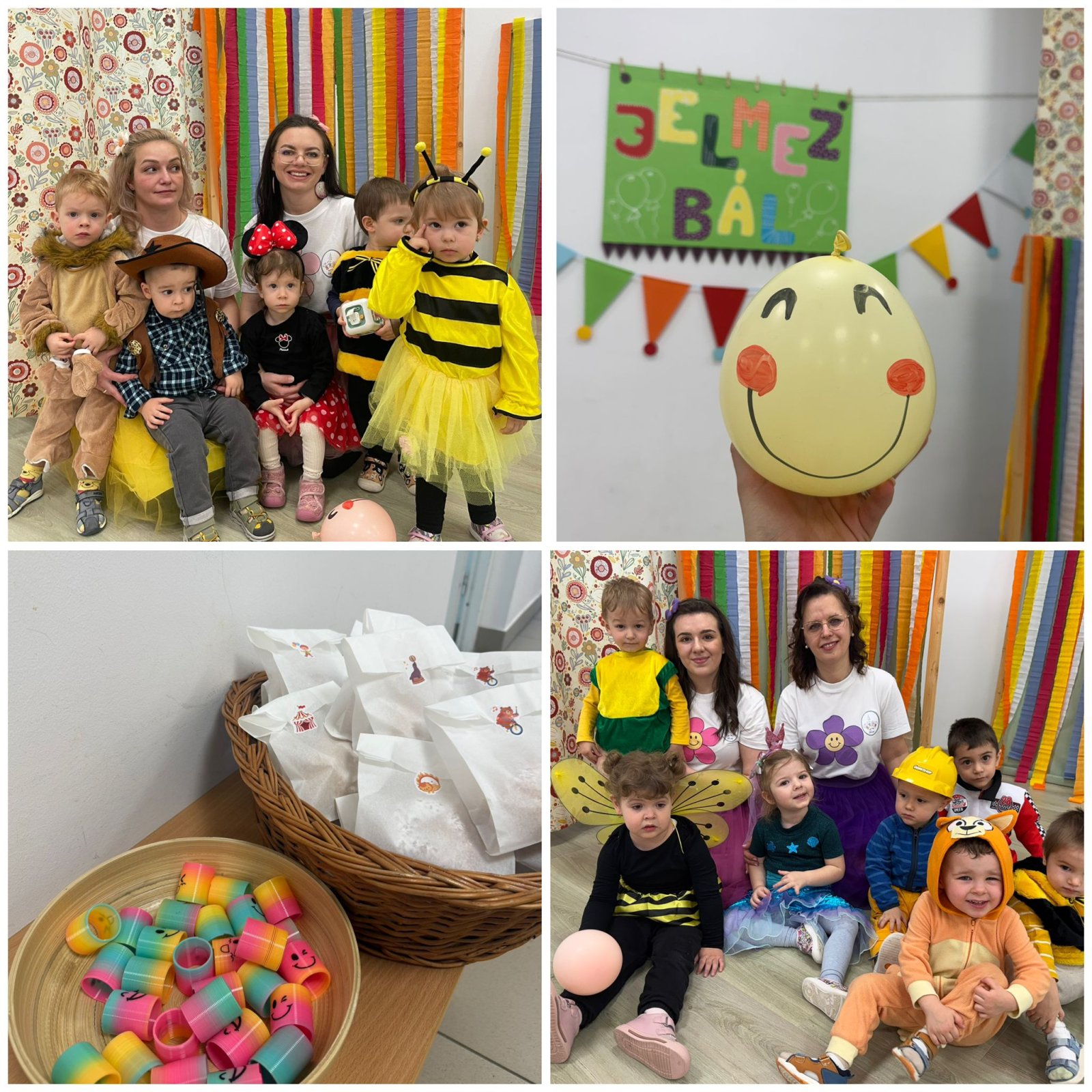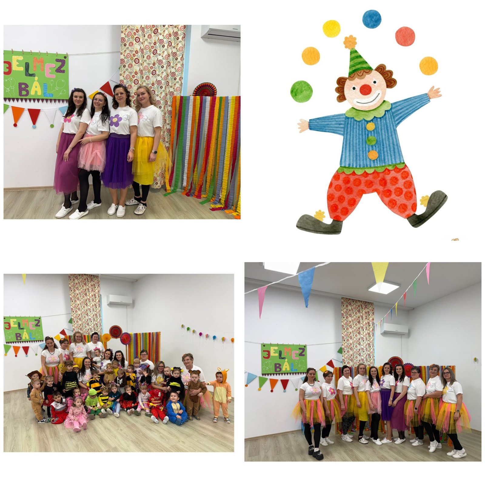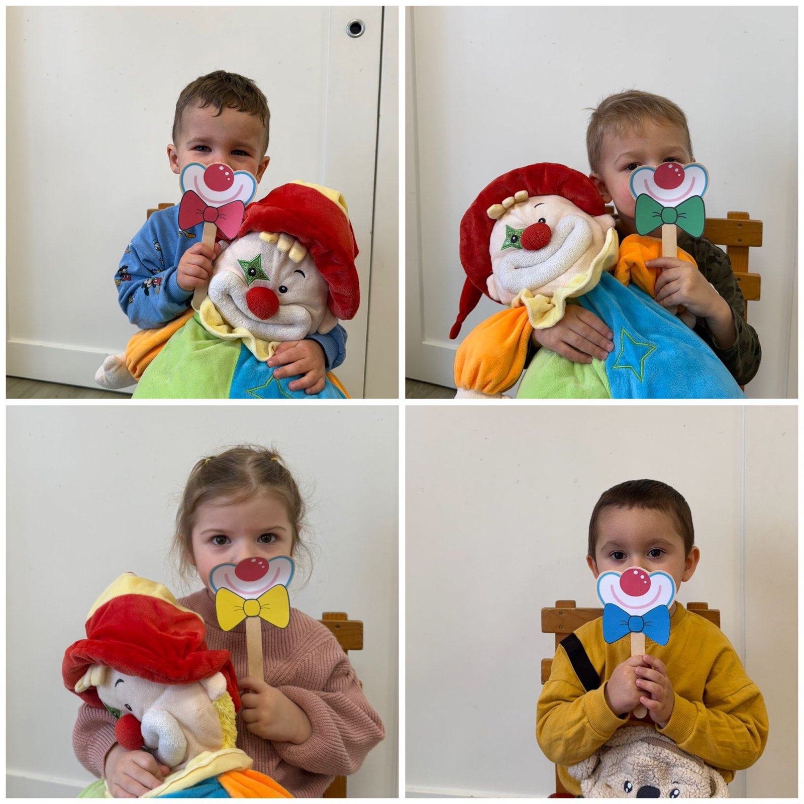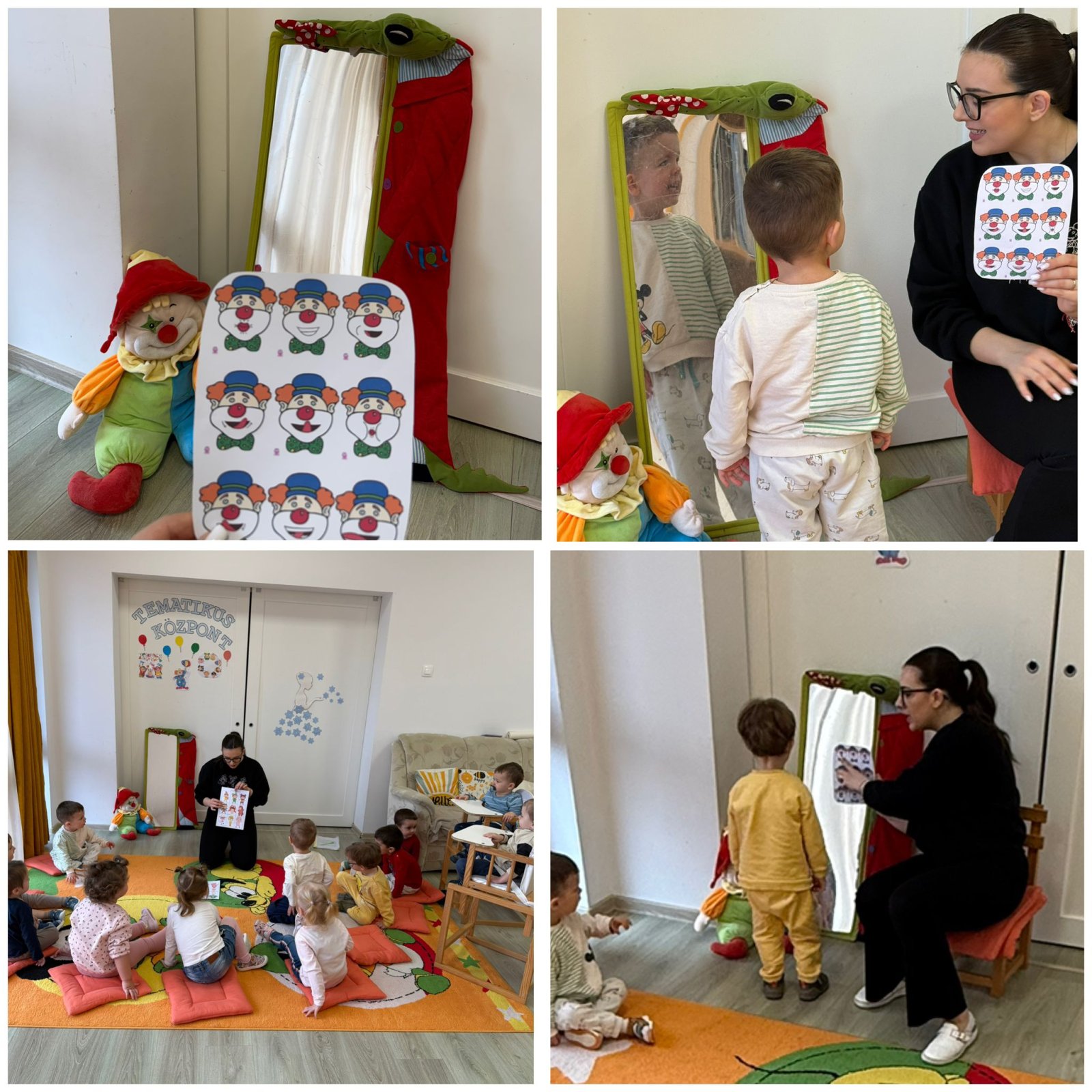 Pénteken Jancsi bohóc egy különleges tükörrel érkezett. Egy kép segítségével különböző ajakgyakorlatokat mutatott, amelyeket a gyermekek a tükör előtt utánozhattak. Ez a tevékenység játékos formában segítette a beszédfejlődést és az artikuláció gyakorlását. Ezt követően gyurmából labdát készítettünk a bohócnak, amely szintén nagy sikert aratott. A hét zárásaként közösen maszkot készítettünk, így minden kisgyermek saját alkotással térhetett haza.