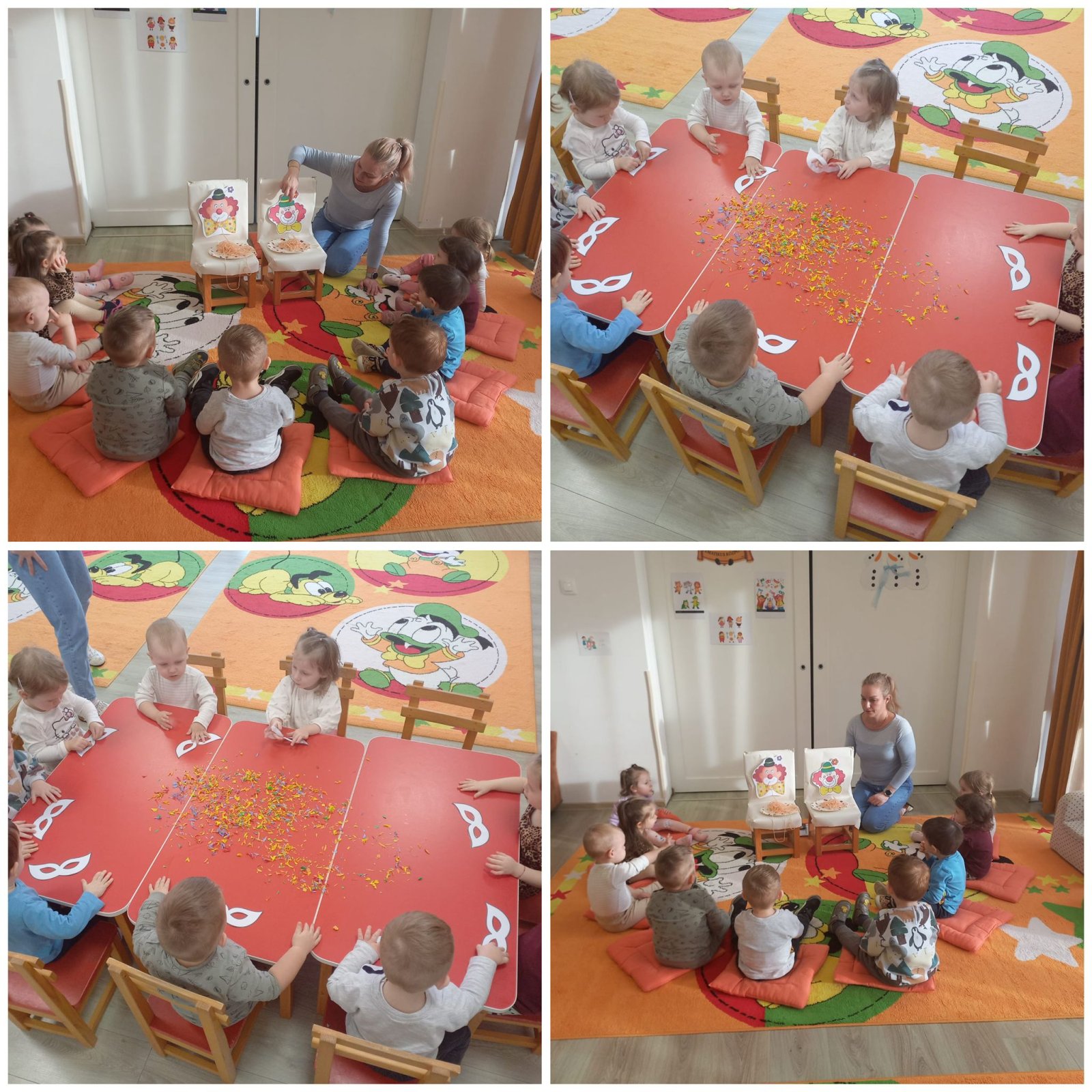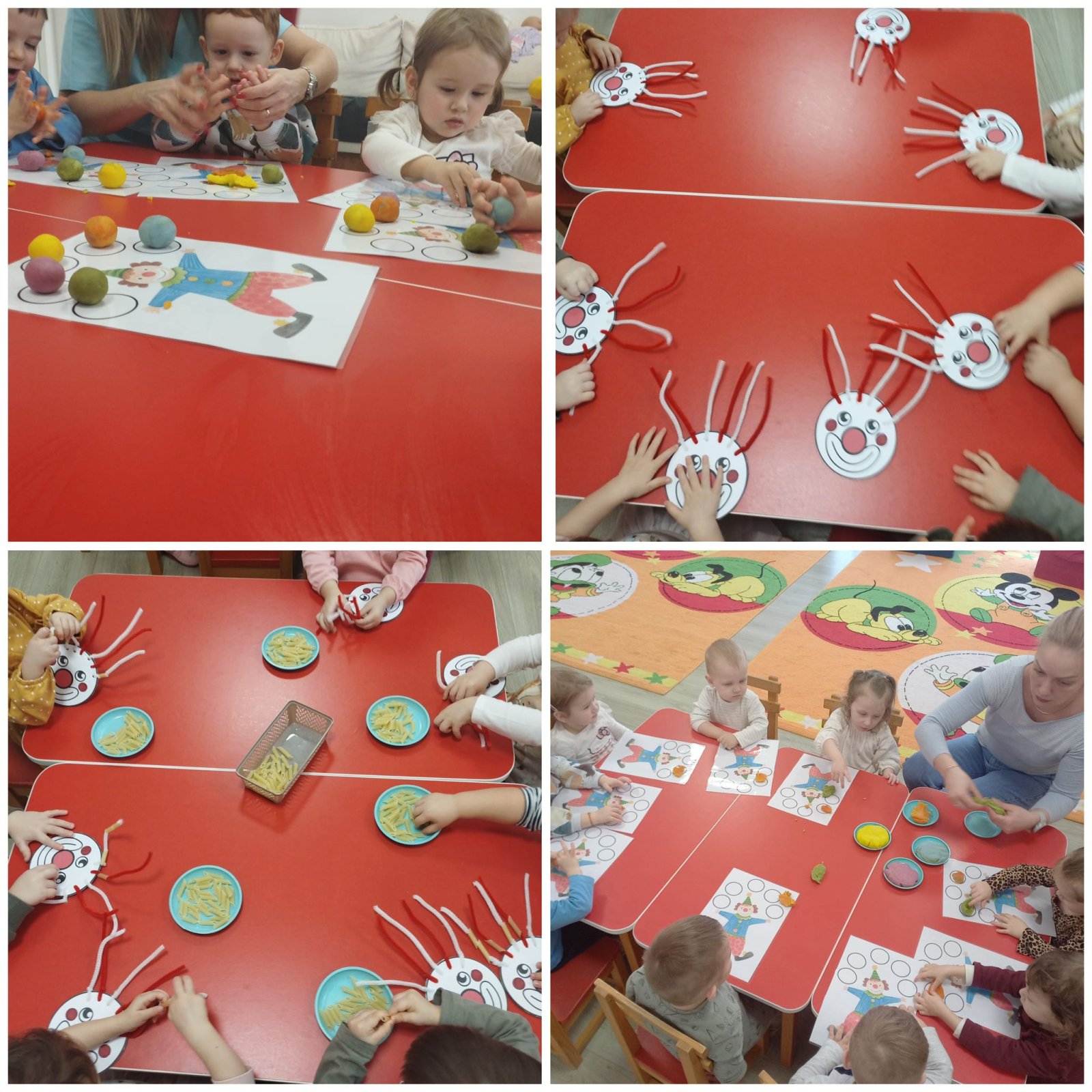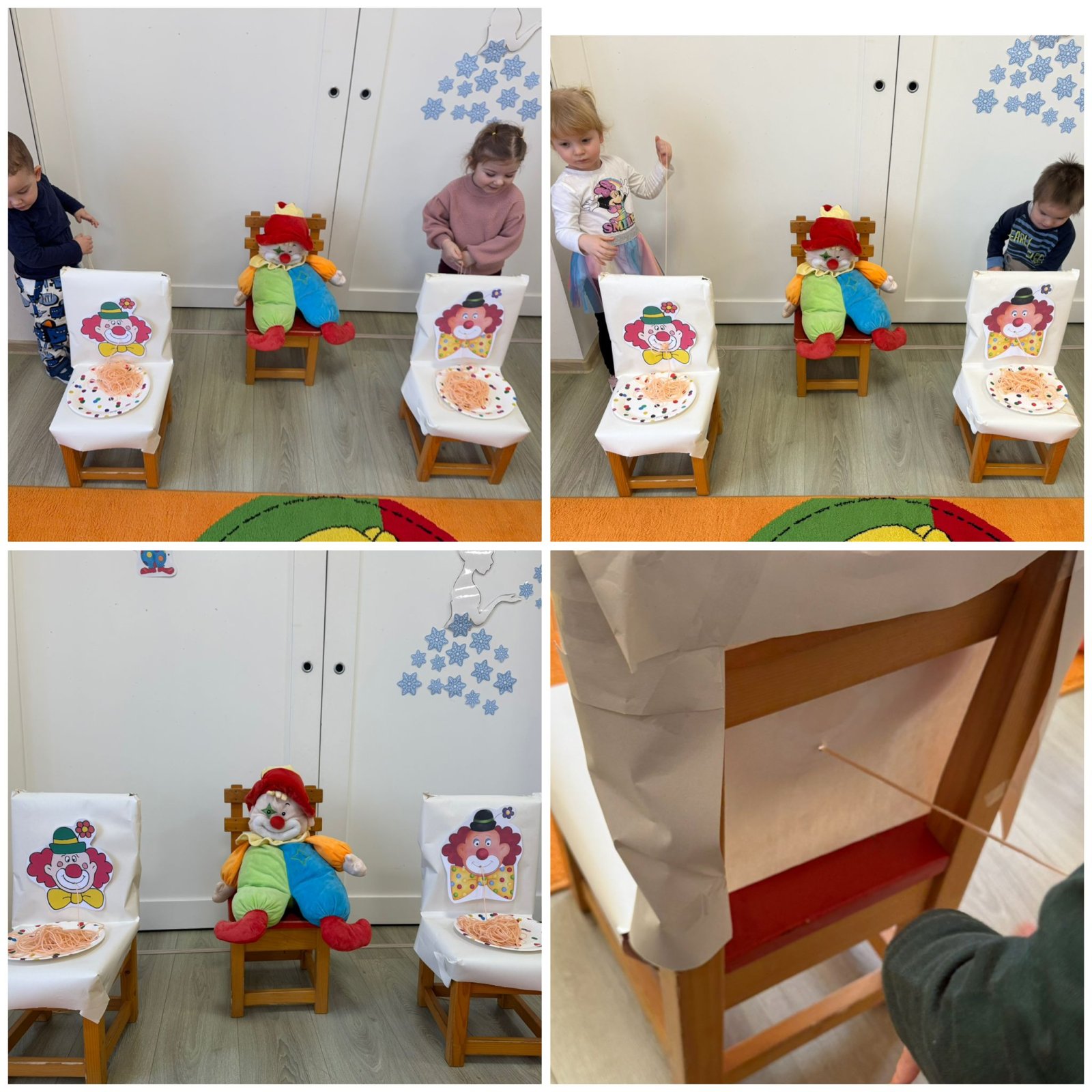 Csütörtökön Jancsi bohóc látogatott el hozzánk, aki vidám játékokkal lepte meg a gyerekeket. Az egyik feladat a „bohócok megetetése” volt, ami vicces feladatnak bizonyult. A másik ügyességi játék során makarónit fűzhettek a bohóc hajára, ami fejlesztette a finommotorikát és a szem-kéz koordinációt. A gyerekek rendkívül élvezték a játékos kihívásokat.