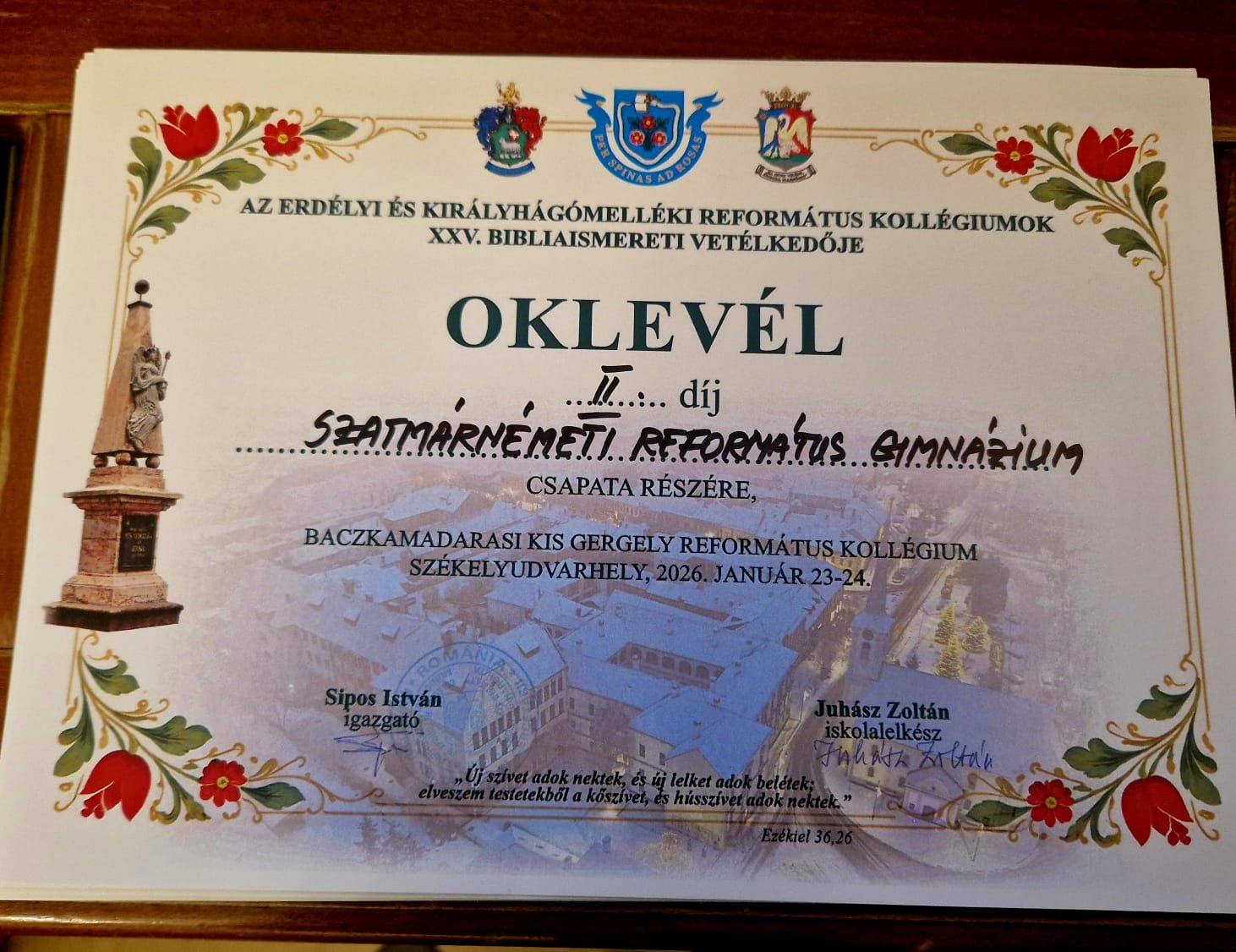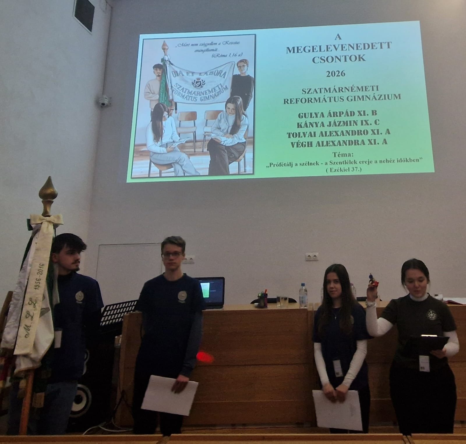Az idei országos Bibliaismereti Vetélkedő második helyezettje, a Szatmárnémeti Református Gimnázium „Megelevenedett Csontok” csapata lett. Gimnáziumunk az eddigi Bibliavetélkedőkön mindig dobogós helyen végzett. Idén a zsűri kiemelte csapatunk kreativitását és a megadott kritériumrendszer pontos betartását méltányolta. Ez különösen a csapat képregényes munkájára vonatkozott